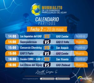 16 equipos de hombres y 14 de mujeres forman parte del Mundialito de los GAD Parroquiales del Azuay. Con la presencia de la presidenta del Club Deportivo Cuenca, Nataly Villavicencio y del exfutbolista y actual directivo del Deportivo Cuenca, Luis Saritama, se realizó la inauguración del evento el viernes 13 de mayo.