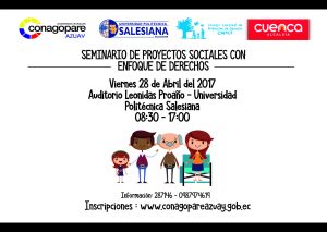 Para inscribirse en el SEMINARIO DE PROYECTOS SOCIALES CON ENFOQUE DE DERECHOS» a realizarse en la UNIVERSIDAD POLITÉCNICA SALESIANA el día viernes 28 de abril del 2017, por favor llenar la ficha de inscripción ingresando en el siguiente link
