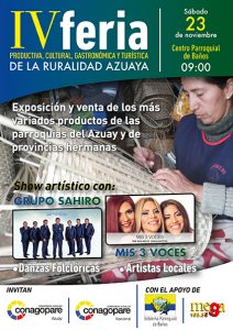 Con la finalidad de fomentar y promocionar los emprendimientos productivos de la ruralidad del Azuay, Conagopare Azuay presenta la IV Feria Productiva, Cultural, Gastronómica y Turística de la Ruralidad Azuaya, este sábado 23 de noviembre en el centro parroquial de Baños; así lo da a conocer la presidente de la instancia parroquial, Janeth Garzón González.